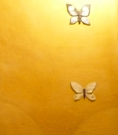 写真は、カジさんの家の壁に埋め込まれた蝶のオブジェ。