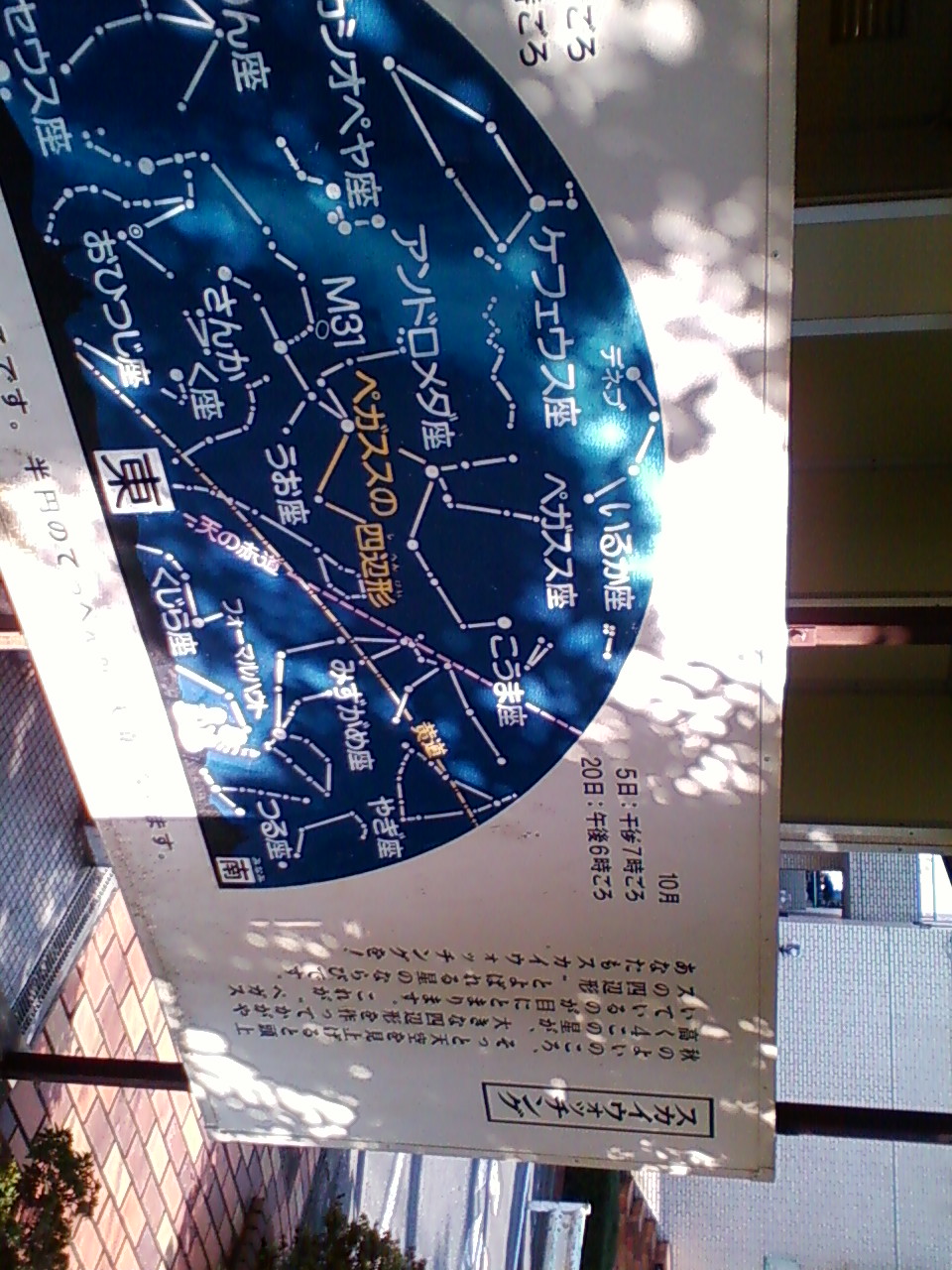 近所の公園を散歩していたら、なんだか見覚えのあるものが…。近づいてみると、星の地図の隅っこに「星になったチロ」のチロちゃんと、天体写真家の藤井旭さんのイラストが!
